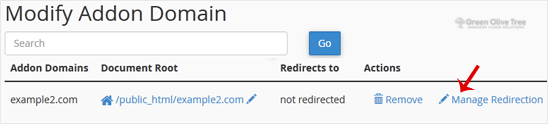 3. Under Modify Addon Domain, locate the add-on domain and click on Manage Redirection.