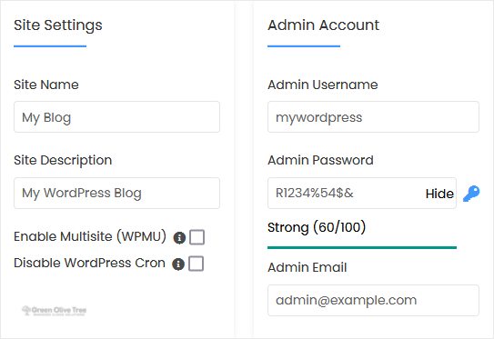 - Admin Username: Your new WordPress username (for security reasons, do not use the administrator or the admin username).