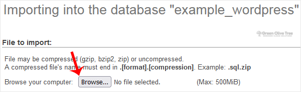 5. Under File to Import, click on Browse and select SQL file from your computer.